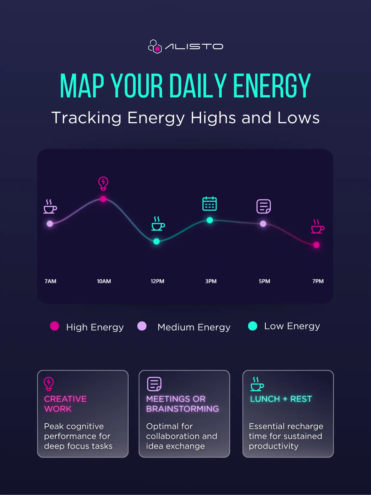 • Trigger tracking: Make note of how your energy shifts after key activities like meals, meetings, deep work sessions, or commuting.