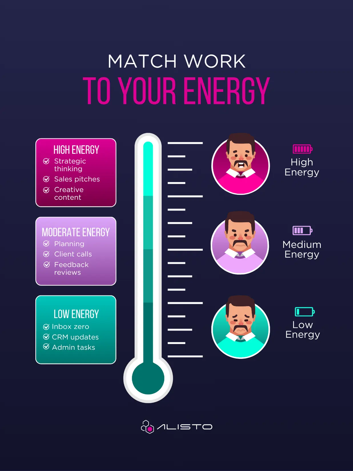 • High energy: Creative work, strategic thinking, sales calls, visibility work (public speaking, leadership coaching).