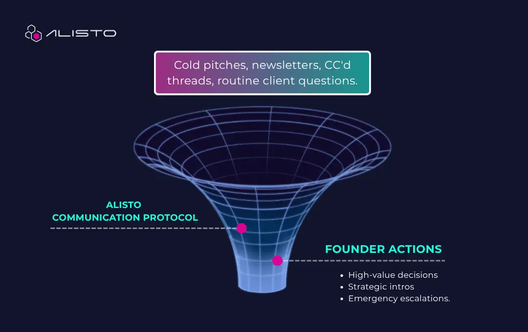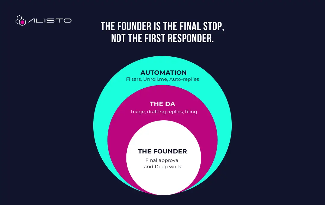 Inbox triage means messages are filtered before they reach the founder. Instead of every email landing directly in your attention, communication moves through a structured process.